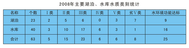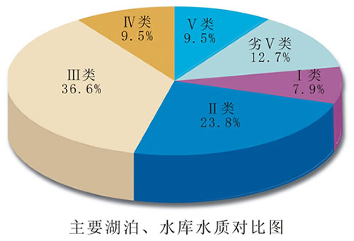 全省开展水质监测的63个湖泊、水库中,Ⅰ~Ⅱ类水质的占31.7%;Ⅲ类水质的占36.6%;Ⅳ类水质的占9.5%;Ⅴ类水质的占9.5%;劣Ⅴ类水质的占12.7%。水质达到水环境功能要求的占39.7%。