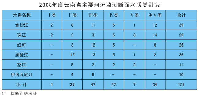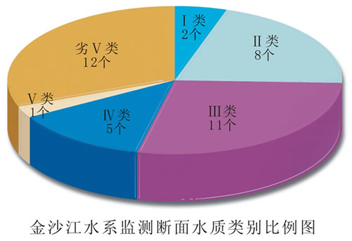 金沙江水系水质总体为中度污染。22条主要河流39个监测断面中,达到Ⅰ~Ⅱ类标准水质优的断面占25.6%;达到Ⅲ类标准水质良好的断面占28.2%;达到Ⅳ类标准水质轻度污染的断面占12.8%;达到Ⅴ类标准水质中度污染的断面占2.6%;劣Ⅴ类标准水质重度污染的断面占30.8%。