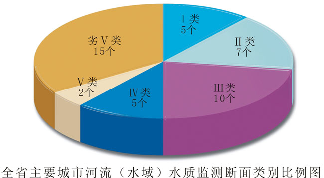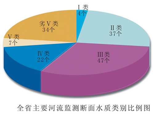 在77条主要河流的151个监测断面中,水质优达到Ⅰ~Ⅱ类标准的断面占27.2%;水质良好达到Ⅲ类标准的断面占31.1%;水质已受轻度污染达到Ⅳ类标准的断面占14.6%;水质已受中度污染达到Ⅴ类标准的断面占4.6%;水质已重度污染劣于Ⅴ类标准的断面占22.5%。