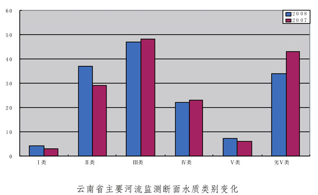 与上年相比,主要河流监测断面中,水质达到Ⅰ~Ⅱ类标准的增加28.13%,水质达到Ⅲ类标准的减少2.1%,水质达到Ⅳ类标准的减少4.3%,水质达到Ⅴ类标准的增加16.7%,水质为劣Ⅴ类的减少20.9%。达到地表水环境功能要求的断面增加7.7%。