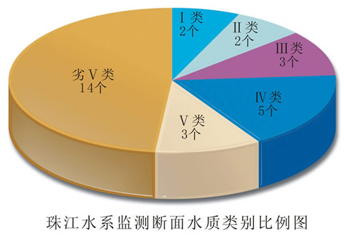 珠江水系总体水质为重度污染。9条主要河流29个监测断面中,达到Ⅰ~Ⅱ类标准水质优的断面占13.8%;达到Ⅲ类标准水质良好的断面占10.3%;达到Ⅳ类标准水质轻度污染的断面占17.2%;达到Ⅴ类标准水质中度污染的断面占10.3%;劣Ⅴ类标准水质重度污染的断面占48.4%。