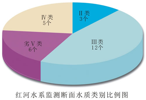 红河水系总体水质轻度污染。12条主要河流26个监测断面中,达到Ⅰ~Ⅱ类标准水质优的断面占11.5%;达到Ⅲ类标准水质良好的断面占46.2%;达到Ⅳ类标准水质轻度污染的断面占19.2%;劣Ⅴ类标准水质重度污染的断面占23.1%。