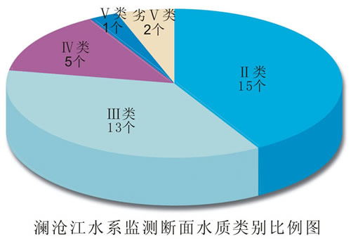 澜沧江水系总体水质轻度污染。23条主要河流36个监测断面中,达到Ⅱ类标准水质优的断面占41.7%;达到Ⅲ类标准水质良好的断面占36.1%;达到Ⅳ类水质标准水质轻度污染的断面占13.9%;达到Ⅴ类标准水质中度污染的断面占2.8%;劣Ⅴ类标准水质重度污染的断面占5.5%。