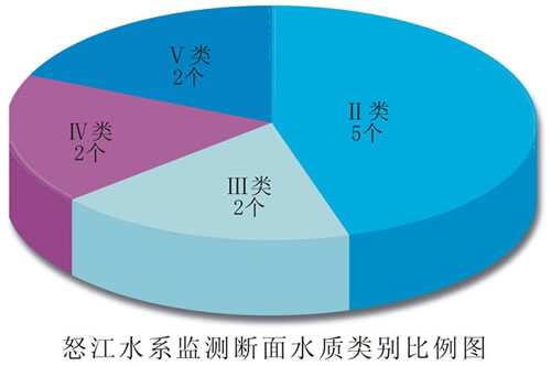 怒江水系总体水质轻度污染。5条主要河流11个监测断面中,达到Ⅰ~Ⅱ类标准水质优的断面占45.4%;达到Ⅲ类标准水质良好的断面占18.2%;达到Ⅳ类标准水质轻度污染的断面占18.2%;达到Ⅴ类标准水质中度污染的断面占18.2%。