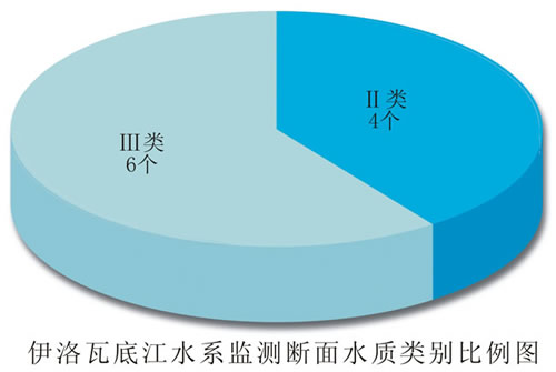 伊洛瓦底江水系总体水质优。6条主要河流10个监测断面中,达到Ⅱ类标准水质优的断面占40.0%;达到Ⅲ类标准水质良好的断面占60.0%。